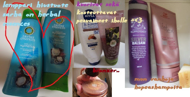 En ole hirveästi ottanut itsestäni kuvia. Tässä kuitenkin melko kattava kuva, mitä minulla on kaikkea veskissä kaapeissa. Tai no, meikinpoistoaineesta (Rimmel) unohtui kuva...
